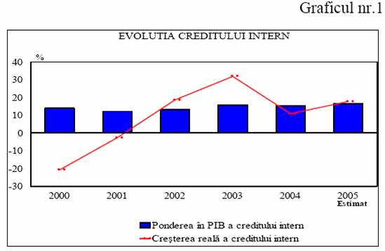 Romania a cunoscut in ultimii 3 ani o expansiune rapida a creditului intern, cresterea reala fiind in medie de aproape 20%, dar cu toate acestea, ponderea sa in PIB se mentine inca la un nivel redus. Dupa estimarile Comisiei Nationale de Prognoza pentru anul 2005, ponderea creditului intern in PIB s-ar putea majora cu cel mult 1 punct procentual.