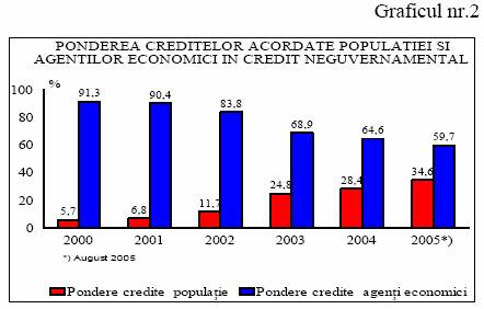 Agentii economici continua sa detina cea mai mare parte din imprumuturile bancare (circa 60%). Dintre acestea, cresterea creditelor in lei pe termen mediu si lung este semnificativa, situandu-se la 54% (august fata de august 2004), ca o consecinta a scaderii inflatiei, dar si a unor dobanzi mai atractive, ceea ce semnifica imbunatatirea inclinatiei acestora pentru investitii. Conform estimarilor CNP aceste categorii de credite isi vor amplifica cresterea in 2006, ponderea lor in total putand ajunge la 65%.
