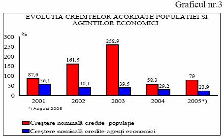 O dinamica mai accentuata s-a inregistrat la imprumuturile acordate populatiei, respectiv 64,3% in termeni reali, dinamica mult superioara veniturilor salariale. De subliniat este ca, dupa expansiunea din 2003, cresterea creditelor acordate persoanelor fizice a cunoscut o temperare, care este cu atat mai importanta daca este corelata cu dinamica veniturilor. Astfel, daca in 2003 la o crestere a veniturilor cu 27,7%, creditele populatiei se majorau cu 258,9%, rezultand un indice de devansare de 2,81, in primele 8 luni ale a.c. acest indice s-a redus la 1,44.
