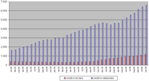 in perioada analizata creditul in lei s-a mentinut constant sub 400 milioane RON pana in octombrie 2005, cand a depasit acest prag, ajungand ca in urmatoarele 12 luni sa se tripleze, de la 420 milioane RON valoare inregistrata in octombrie 2005 la 1.100 milioane RON valoare inregistrara in noiembrie 2006;