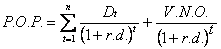 c. In cazul obligatiunii cu cupon, avand valoarea nominala, V.N.O., care este remunerata anual cu o suma de bani, D, avand scadenta n, rata de piata a dobanzii fiind r.d., pretul de vanzare al obligatiunii in prezent, P.O.P.,va fi,