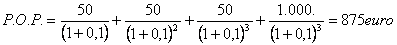 De exemplu, avand V.N.O = 1.000 euro, D = 50 euro, n =3 ani, r.d. = 10%, vom avea,