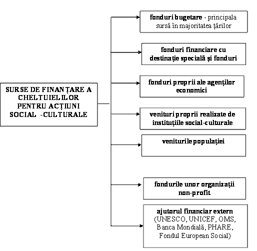 Sursele de finantare a cheltuielilor pentru actiuni social-culturale, prezentate in mod sintetic, se concretizeaza atat in resurse bugetare, cat si extrabugetare in surse publice sau private, interne sau externe, dupa caz.