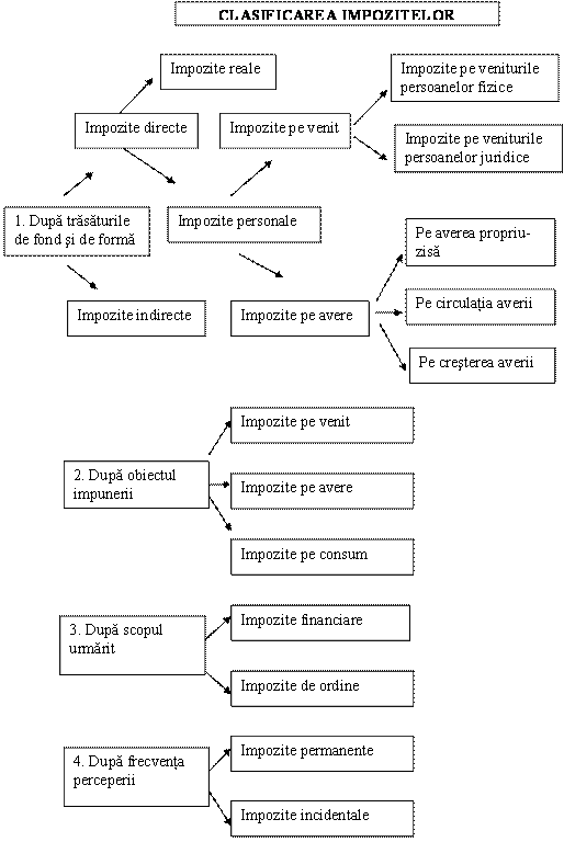 Impozitele instituite in majoritatea statelor lumii sunt de o mare diversitate si se deosebesc atat prin trasaturile de forma, cat si de continut. Pentru a sesiza mai usor efectele diferitelor categorii de impozite pe plan economic, social si politic, se impune gruparea acestora pe baza unor criterii stiintifice.