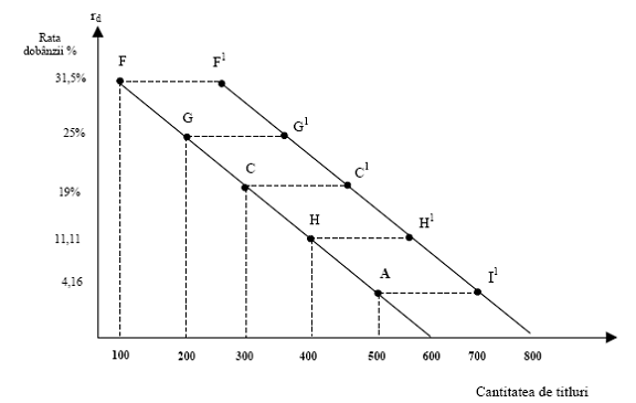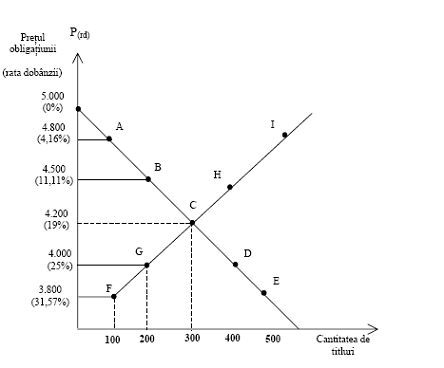 Daca rata dobanzii estimata de investitori pentru obligatiuni inregistreaza un nivel inalt, in timp ce alte variabile din economie (venit, rata rentabilitatii, risc, lichiditate) raman constante, atunci cantitatea de titluri trebuie sa sporeasca, in conformitate cu teoria cererii. Figura prezentata arata ca, in punctul B cantitatea de titluri cerute, sporeste de la 100 la 200, ca urmare a rentabilitatii sporite pe care o confera detinatorilor acest tip de active. Daca pretul obligatiunilor, se modifica, in sensul diminuarii pana la 3.800 u.m. (cu o rentabilitate de 31,57%) cantitatea ceruta va avea cel mai ridicat nivel, in punctele D si E. Dreapta care uneste toate punctele care reflecta cererea de titluri, este denumita curba cererii pentru obligatiuni (dreapta AE).