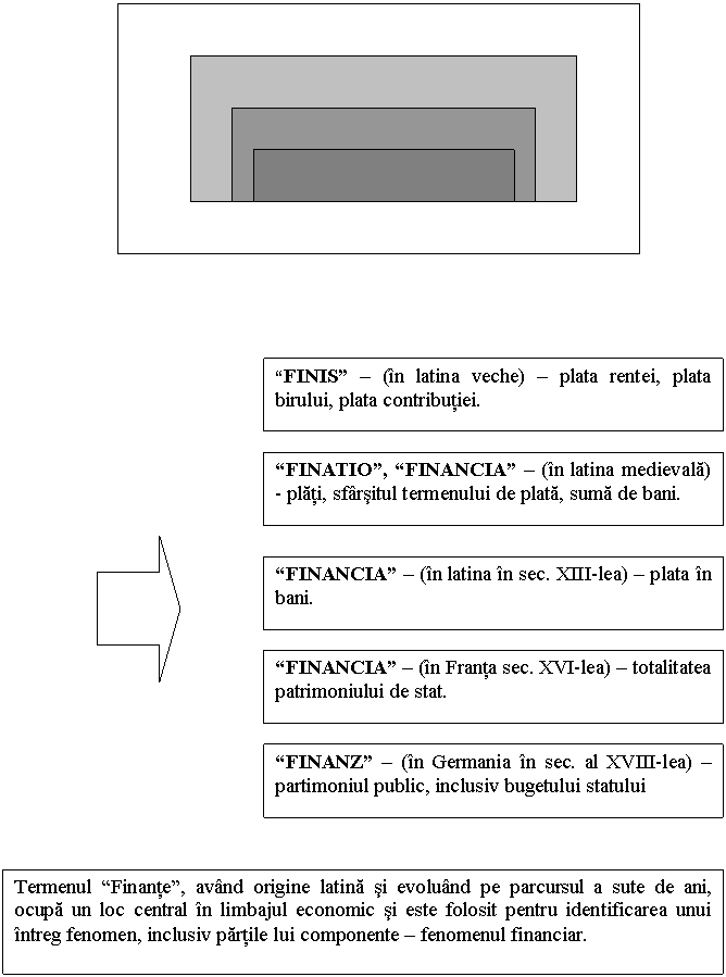 In secolele XIV-XV in Franta circulau asa expresii ca "financ" - o suma de bani sau venit al statului, "finaces" - patrimoniul statului. In secolul XVI, in limba germana se folosea expresia "finaz" - plata in bani.