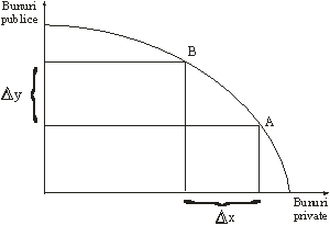 Dupa cum se observa in figura nr. 2 atunci cand statul se hotaraste sa preia la dispozitia sa o parte mai mare din resursele societatii, pentru a oferi mai multe bunuri si servicii publice, mutandu‑se in acest scop din punctul A in punctul B pe frontiera resurselor financiare ale societatii, cantitatea de bunuri si servicii publice pe care o ofera suplimentar (∆Y) nu este gratuita, ci ea are un cost de oportunitate, reprezentat de cantitatea de bunuri si servicii (∆X) care putea fi achizitionata de pe piata de intreprinderi si de populatie cu resursele financiare preluate de stat.