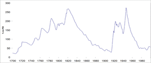 Graficul 2, Evolutiile datoriei publice in Marea Britanie din 1700 incoace