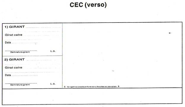 c) girarea - operatiune prin care se transmite, odata cu remiterea, si toate drepturile rezultate din cec. Ea este o mentiune speciala facuta pe verso-ul cecului in favoarea oricui, inclusiv in favoarea tragatorului. Noul beneficiar poate, la randul lui, sa gireze cecul.