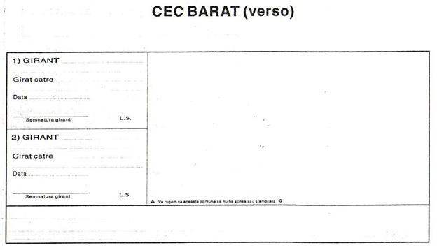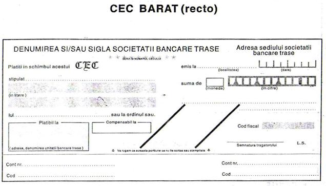 Cecul care poarta doua linii paralele verticale sau oblice, dar nu orizontale, oriunde pe fata instrumentului si care, in spatiul delimitat d aceste linii, are inscrisa denumirea societatii bancare - B.C.R., se numeste cec cu barare speciala. In cazul cecului cu barare speciala sau generala, beneficiarul este obligat sa recurga la serviciul unei societati bancare, printr-o unitate bancara apartinand B.C.R., care sa primeasca plata in locul sau.