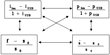 Este evident din aceasta schema ca diferentialul de inflatie se refera la piata bunurilor si serviciilor, diferentialul de dobanda se refera la piata monetara, diferentialul forward / spot (care arata dimensiunea primei sau a discountului) se refera la piata valutara, mai exact la acea componenta ce are in vedere suma operatiunilor de acoperire a riscurilor derulate de diferiti agenti economici implicati in afaceri pe piata internationala si diferentialul spot asteptat / spot se refera la componenta speculativa a pietei valutare.