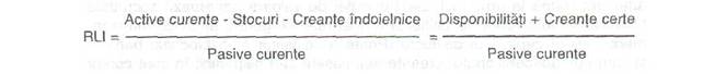 2. Rata lichiditatii intermediare (Testul acid-Quick Ratio) demonstreaza posibilitatea de acoperire imediata a obligatiilor pe termen scurt. Ea se calculeaza dupa relatia: