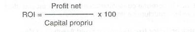 4. Rentabilitatea capitalului propriu { ROI - Return on investment) ROI mai e cunoscut si ca Return on Equity. El reprezinta unul din cei mai importanti indicatori ai profitabilitatii, fiind folosit de proprietarii unei companii sau potentialii finantatori in luarea unei decizii de investitie. Se calculeaza pe baza raportului: