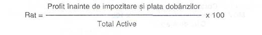 5. Rentabilitatea activelor totale {Return on Total Assets) Acest indicator masoara rentabilitatea unei intreprinderi ca procentaj din ansamblul activelor angajate de aceasta. Indicatorul 'Rentabilitatea activelor totale' este o alternativa la indicatorul 'Rentabilitatea capitalului propriu', con-siderandu-se ca profitabilitatea in sine nu depinde de metoda de finantare. Aceasta din urma este o optiune a managementului. Indicatorul se calculeaza astfel: