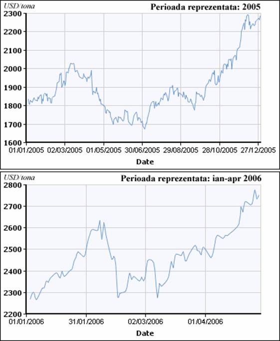 Alro Slatina este singurul producator de aluminiu primar din tara. In anul 2005 contextul international a fost favorabil societatii, a crescut cererea de aluminiu pe plan international, ceea ce a dus la cresterea cotatiei la bursa de metale din Londra., asa cum se poate observa in graficele de mai jos, comparativ pentru anii 2005 si 2006.