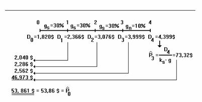 = rata de crestere, valabila atat pentru castiguri, cat si pentru dividende, in perioada de crestere supranormala = 30% (Nota: rata de crestere in perioada de crestere supranormala poate sa varieze de la an la an. De asemenea, se pot inregistra cateva perioade diferite de crestere supranormala: de exemplu, o crestere la un ritm de 30% pe o perioada de 3 ani, dupa aceea o crestere la un ritm de 20% pentru urmatori 3 ani, si abia dupa aceea o crestere constanta de 10%.) |