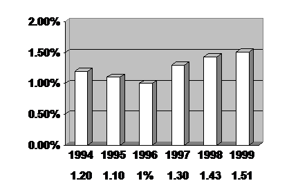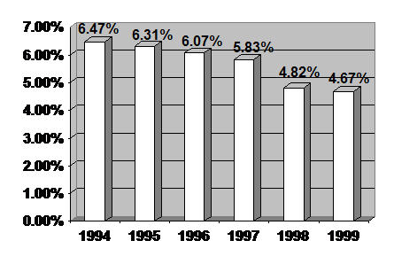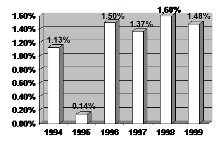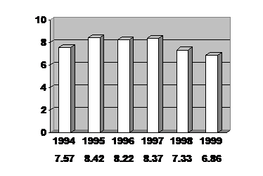 In continuare voi prezenta evolutia ponderii in PIB a accizelor intre anii 1994-1999: