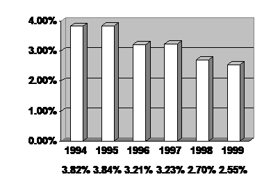 In perioada 1994 - 1997, ponderea accizelor in PIB a descrescut de la 7.5 % in 1994 la 1,3 % in 1997, dupa care creste la 1,5 % in 1999.