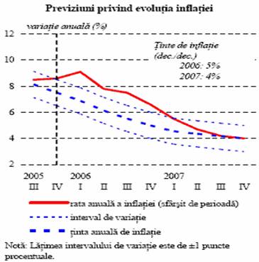 Ca urmare, in pofida faptului ca pe termen scurt rata inflatiei proiectate se situeaza in permanenta deasupra traiectoriei programate a dezinflatiei, devierea de la tinta in anul 2006 este perceputa a avea caracter temporar in conditiile unei actiuni ferme si proactive a politicii monetare, sprijinite de prudenta politicilor salariala si fiscala; necesitatea de a realiza o mai buna ancorare a anticipatiilor inflationiste si de a orienta in consecinta deciziile operatorilor economici, avand in vedere faptul ca o eventuala revizuire a tintei de inflatie pe 2006 ar conduce la deteriorarea sensibila a performantelor inflationiste pe termen mediu, complicand conduita politicii monetare in viitor;