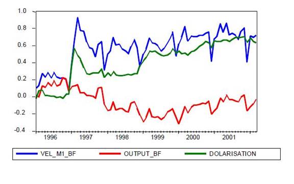 Folosirea banilor pentru tranzactii este determinata o elasticitate subunitara in raport cu venitul agregat si negativ de gradul de dolarizare al economiei. Elasticitatea subunitara in raport cu productia este cauzata de proliferarea creditului comercial si cresterea arieratelor. Dolarizarea economiei este determinata factori precum gradul de deschidere a economiei si substitutia monetara. Astfel, viteaza lui M1 este pozitiv corelata cu productia si substitutia montara: