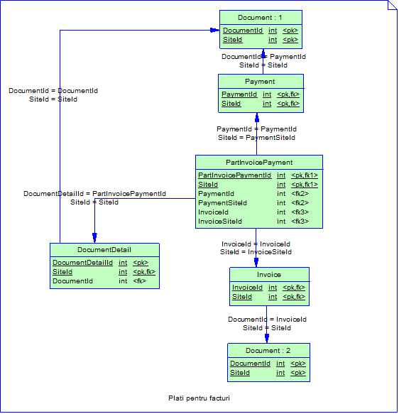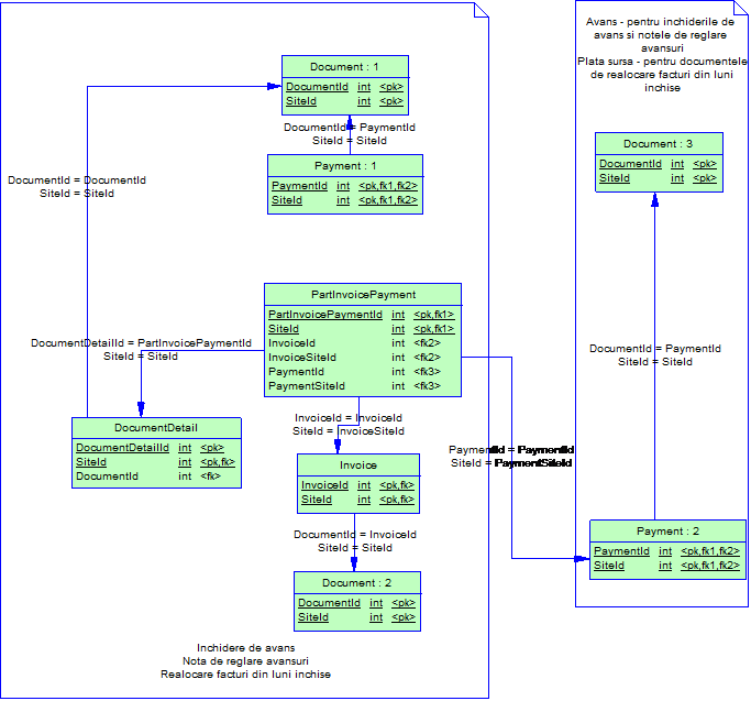 Aceste campuri sunt foarte importante pentru calculul valorilor platite sau incasate pe facturi. Aceasta se intampla datorita comportamentului diferit in cazul inchiderilor de avans, notelor de reglare avansuri si realocarilor de facturi pe de o parte, si celelalte plati pe de alta parte. Astfel pentru primul caz PaymentId si PaymentSiteId refera avansul (plata sursa) si nu header-ul documentului, iar in cazul al doilea refera headerul documentului.