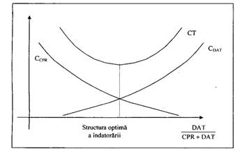 Figura 2. Structura optima a indatorarii la echilibrul dintre costurile marginale ale capitalului propriu (CDAT) si cele ale datoriilor