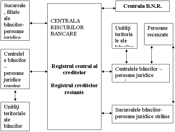 Activitatea Centralei Riscurilor Bancare este reglementata de Regulamentul nr.1/1999, care prevede colectarea, stocarea si centralizarea informatiilor privind expunerea fiecarei banci din sistemul bancar romanesc fata de debitorii care au beneficiat de credite/angajamente al caror nivel cumulat depaseste suma limita de raportare de 200 milioane lei, precum si a informatiilor referitoare la creditele cu o valoare mai mica de 200 milioane lei la care se inregistreaza intarzieri la plata mai mari de 30 de zile.
