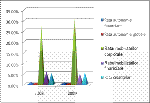 Rata autonomiei financiare si globale arata cat din patrimoniul societatii este finantat din resursele proprii fata de totalul pasivului, astfel acestea in graficul de mai sus prezinta o scadere in anul 2009 fata de anul 2008.