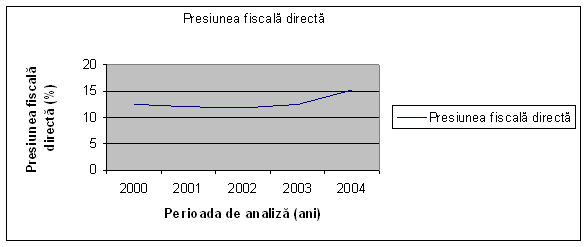Din datele tabelare reiese ca presiunea fiscala directa a avut o usoara tendinta de scadere in perioadei analizata 2001-2002 de la 12,14 % pana la 11.78 % ca apoi sa urmeze un trend crescator pe urmatorii doi ani.