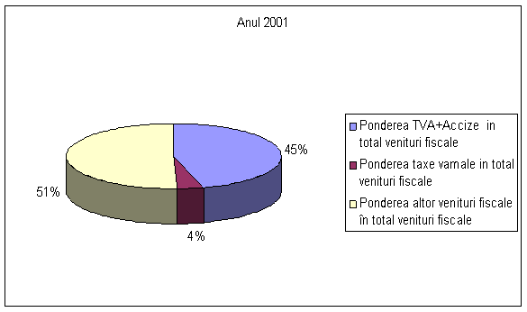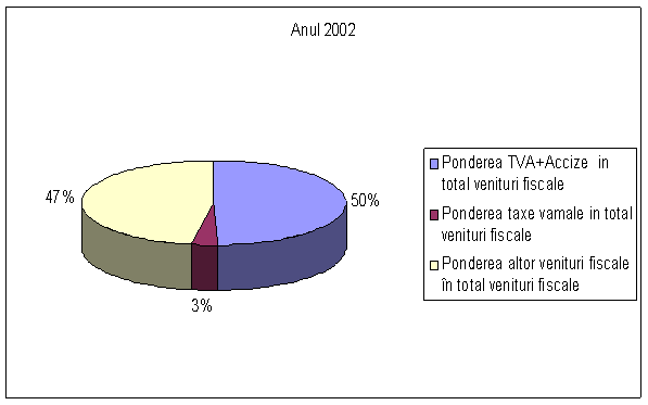 Aproximativ, in toti anii avuti in vedere, fiscalitatea indirecta este sustinuta de TVA si accize in medie de 50%-51%, urmate de taxele vamale a caror pondere din veniturile fiscale totale ale bugetului general consolidat este de 4%-5%. Ponderea mare, pe care o detin accizele si TVA in veniturile fiscale poate fi pusa pe seama cresterii consumurilor de bunuri si produse importate dar si pe faptul ca nivelul accizelor este majorat prin hotarare a Guvernului, in conformitate cu angajamentele asumate de Romania in procesul de negociere cu Uniunea Europeana