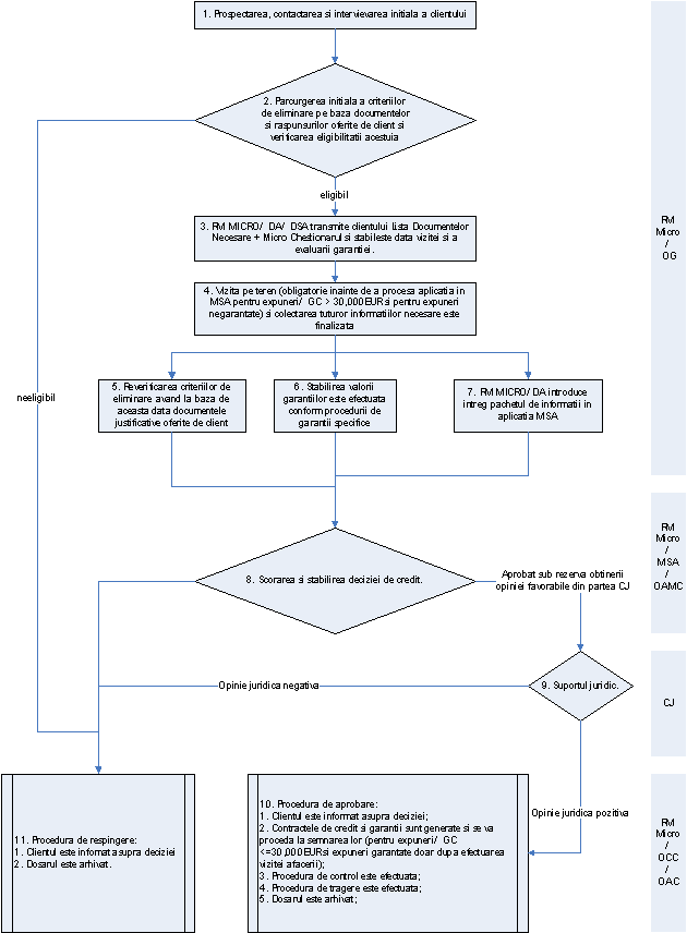 - Fluxul de lucru descris in tabelul anterior nu se aplica solicitarilor de credit procesate pe fluxurile specifice, descrise in "Ghidul de instructiuni privind Manualul de Micro Credite" si nici solicitarilor din partea activitatilor preofesionale individuale (PFA).