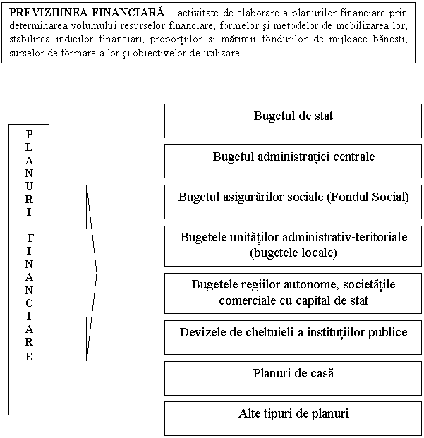 I. Previziunea financiara - reprezinta activitatea de elaborare a planurilor financiare prin determinarea volumului resurselor financiare, formelor si metodelor de mobilizare a lor, stabilirea indicatorilor financiari, proportiilor si marimii fondurilor de mijloace banesti, surselor de formare a lor si obiectivelor de utilizare. Exemple: