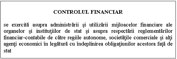 Controlul financiar se exercita asupra utilizarii mijloacelor financiare ale organelor si institutiilor de stat si asupra respectarii reglamentarilor financiar - contabile de catre regiile autonome, societatile comerciale si alti agenti economici in legatura cu indeplinirea obligatiunilor acestora fata de stat.