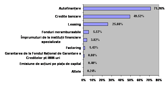 Avand in vedere modalitatile de finantare a activitatilor economice la care au apelat intreprinzatorii/managerii din IMM-uri pe parcursul ultimului an, rezultatele investigatiei releva urmatoarele: 71,26% dintre firme s-au autofinantat, 49,52% dintre companii au obtinut credite bancare, 25,88% din intreprinderi au utilizat leasingul, 5,57% dintre IMM-uri au recurs la fonduri nerambursabile si 3,82% din societatile comerciale au efectuat imprumuturi de la institutii financiare specializate.