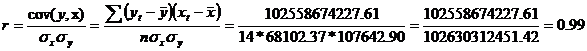 Coeficientul de corelatie liniara fiind definit in intervalul [-1;1] , rezulta ca valoarea obtinuta de 0.99 indica o puternica corelatie liniara intre cele doua variabile. Verificarea verosimilitatii modelului se face cu ajutorul analizei dispersionale (analiza variatiei).