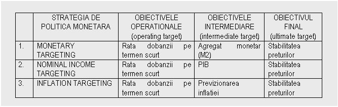 Avand in vedere mediul in care actioneaza banca centrala (atat din punct de vedere al pozitiei jucate in cadrul programului de politica macroeconomica, cat si din punct de vedere al independentei acesteia) si in fucntie de obeictivul fundamental de politica macroeconomica, se stabileste strategia de politica monetara ce urmeaza a fi adoptata si aplicata.