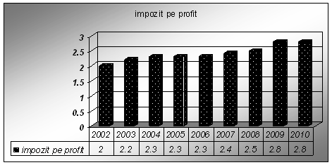 Estimarile privind impozitul pe profit releva o pondere relativ constanta a acestuia in PIB (2,3 -2,4) pe intraga perioada prognozata, legislatia in domeniu aprobata asigura un sistem unitar pe facilitati pentru toate categoriile de contribuabili , platitori de impozit pe profit .