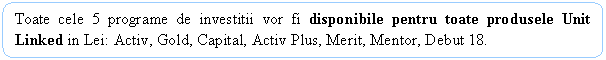 Durata recomandata pentru efectuarea investitiilor intr-un anumit program de investitii este doar cu titlu informativ si nu reprezinta o garantie ca dupa expirarea acestuia se vor obtine randamente superioare sau ca, din contra, inainte de acest termen nu se pot obtine randamente superioare.