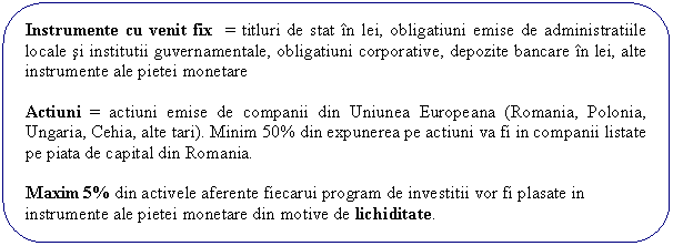 20-40% actiuni; 20-50% onligatiuni guvernamentale si corporatiste; 10-50% alte instrumente de investitii pe termen scurt | ||