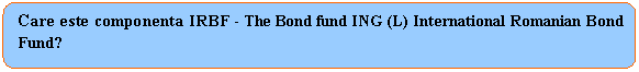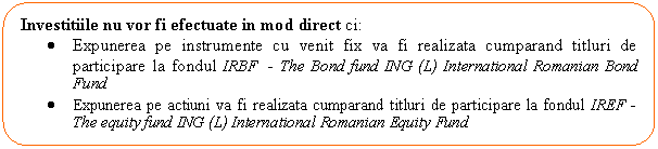 Expunerea pe instrumente cu venit fix va fi realizata cumparand titluri de participare la fondul IRBF - The Bond fund ING (L) International Romanian Bond Fund