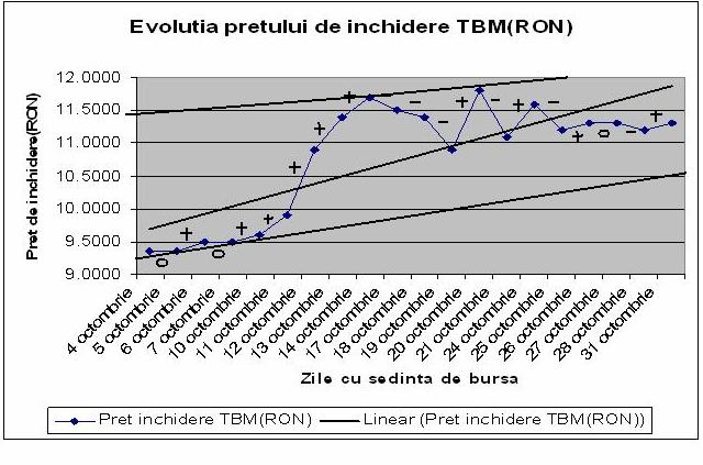 Atat dreapta suport cat si dreapta de rezistenta au o orientare ascendenta ceea ce ne indica un trend ascendend pentru evolutia pretului de inchidere al actiunii TBM in luna octombrie 2005. Cererea ce sustine acest trend este mai mare decat oferta per parcursul perioadei analizate. In urma analizei trendului pentru actiunea TBM putem concluziona ca