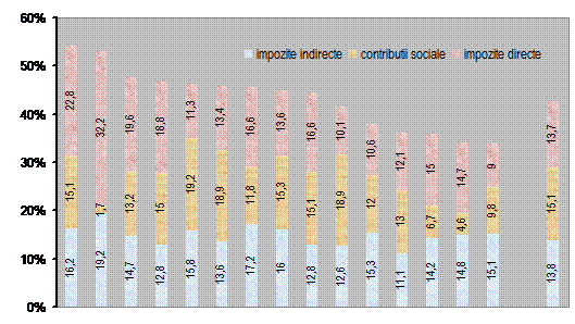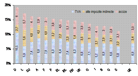 Intre tarile avand pozitii marginale- Grecia si Suedia- decalajul este de 20.2 puncte procentuale. Ponderea impozitelor directe variaza de la 9% in Grecia la 32,2% in Danemarca(media UE de 13,7%), iar impozitele indirecte, alcatuite in cea mai mare parte din TVA si accize, iau valori intre 11,1% in Spania si 19,2% in Danemarca, media in UE fiind de 13,8%.