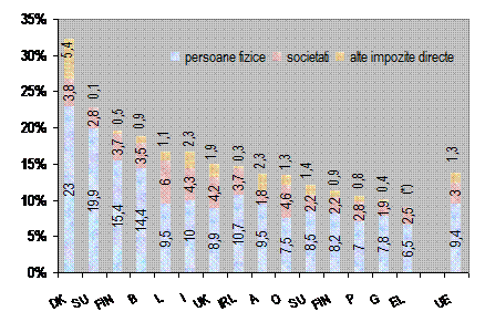 In toate cele 15 tari comunitare, ponderea impozitelor directe in total venituri fiscale este precumpanitoare, cele mai mari ponderi inregistrand Suedia(77,5%), Italia(74,1%), Belgia(73,3%) si Olanda(71,5%), iar cele mai mici Portugalia(57,3%), Irlanda(60,3%) si Grecia(59%). Pe feluri de impozite, de la o tara la alta apar disparitati deloc neglijabile :
