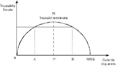 Dupa cum se poate observa, la inceput pe masura ce creste cota de impunere, cresc si incasarile fiscale pana in punctul M, unde acestea sunt maxime, dupa acest punct cresterea cotei de impozitare va duce la scaderea veniturilor fiscale. Conform figurii de mai sus se observa ca acelasi nivel al incasarilor fiscale se obtine si in punctul A, si in punctul B, dar in punctul A nivelul impozitarii este unul redus, pe cand in punctul B nivelul fiscalitatii este unul apasator care creaza mari dificultati contribuabililor si afecteaza functionarea eficienta a economiei.