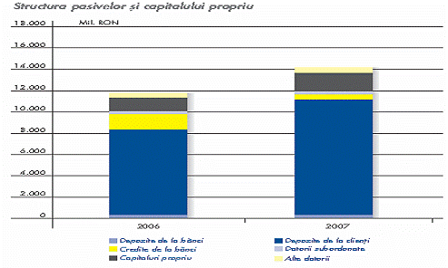 Detalii privind evolutia pasivelor si a capitalului propriu Depozitele atrase de la clienti depaseau 12,9 miliarde RON la sfarsitul anului 2007, cu 30% mai mult decat in decembrie 2006. Peste 40% din aceasta suma reprezinta resurse atrase de la persoanele