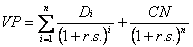 Asa cum s-a aratat intr-un capitol anterior, valoarea prezenta, VP, semnifica faptul ca o suma de bani incasabila in viitor, VV, la o anumita scadenta, n, are o valoare mai mica decat aceasi suma incasata in prezent deoarece, aceasta suma depusa la banca azi va genera o suma mai mare in momentul viitor, datorita adaugarii dobanzilor incasate suplimentar de la banca, D, prin multiplicarea sumei depuse cu rata dobanzii, r.d., relatia amintind de dobanda compusa.