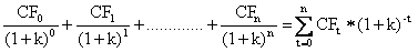 unde CFt reprezinta fluxurile de numerar nete estimate, k este costul marginal al capitalului pentru proiectul respectiv, iar n este perioada pentru care proiectul va fi operational. Costul capitalului, k, depinde de gradul de risc al proiectului, de nivelul ratelor dobanzii in economie si de alti factori. Se considera ca iesirile de numerar (cheltuielile pentru implementarea proiectului, cum ar fi costurile de achizitionare a echipamentului sau de constructie a facilitatilor de productie) sunt negative.