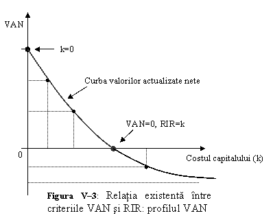 In concluzie, cele doua tehnici ofera aceleasi metode de acceptare sau respingere pentru anumite proiecte, adica daca proiectul este acceptabil dupa criteriile metodei VAN, el este, de asemenea, acceptabil si dupa cele ale metodei RIR. Relatia dintre VAN si costul capitalului k se numeste profilul valorii actualizate nete (VAN). Atunci cand costul capitalului este egal cu zero, valoarea actualizata neta este simpla suma a fluxurilor de numerar. Pe masura ce rata costului de capital creste, fluxurile de numerar care se genereaza intr-un moment mai indepartat de prezent, au o pondere din ce in ce mai redusa in VAN. Odata cu cresterea ratei costului capitalului, VAN se apropie asimptotic de limita inferioara, adica de costul initial al proiectului.