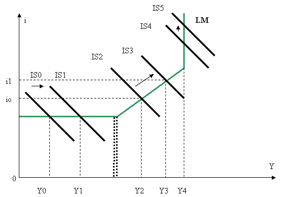 - in zona keynesiana, politica are o eficienta mai redusa, deoarece deplasarea spre dreapta a curbei IS (IS2 la IS3), face sa creasca atat venitul national (Y2 la Y3), cat si rata dobanzii (i0 la i1), care determina scumpirea creditului si implicit franarea investitiilor (efectul de evictiune);