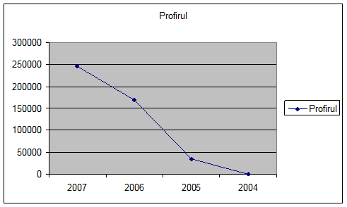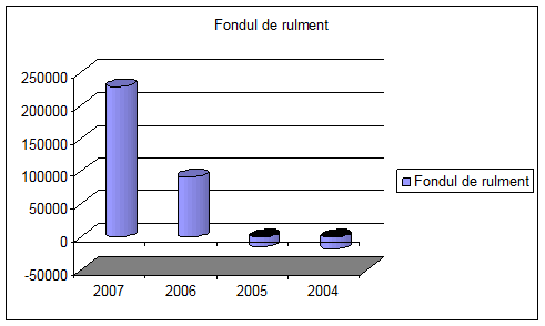 Fondul de rulment este considerat cel mai important indicator al echilibrului financiar, care permite aprecierea pe termen scurt a riscului de incapacitate de plata. Diferenta intre activele circulante si datoriile pe termen scurt a c rescut in fiecare an, aceasta dublandu-se in 2007 fata de 2006, in 2006 fondul de rulment avea urmatoarea valoare 90821 lei iar in 2007 acesta a reusit sa atinga nivelul de 228905 lei, activele circulante fiind mai mari decat datoriile pe termen scurt. Acest lucru duce la o situatie favorabila in ceea ce priveste solvabilitatea pentru ca se sugereaza ca firma are perspective favorabile in ceea ce priveste capacitatea de rambursare